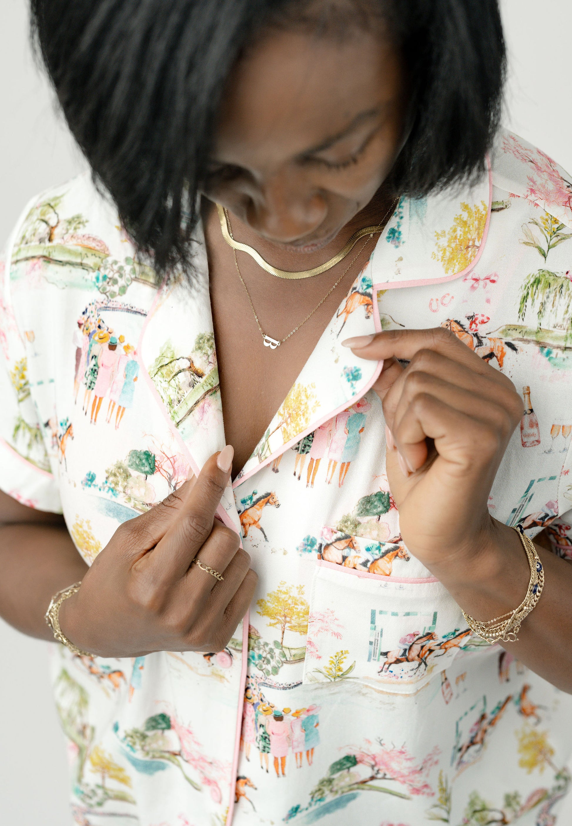 Dreamy days watching the ponies, champagne and friends. The Day at the Races pajama set captures the elegance of a perfect afternoon at the track. Crafted from a luxurious viscose/linen/lyocell blend with lightweight breathability suited for all weather, this set offers effortless sophistication and all-day comfort.