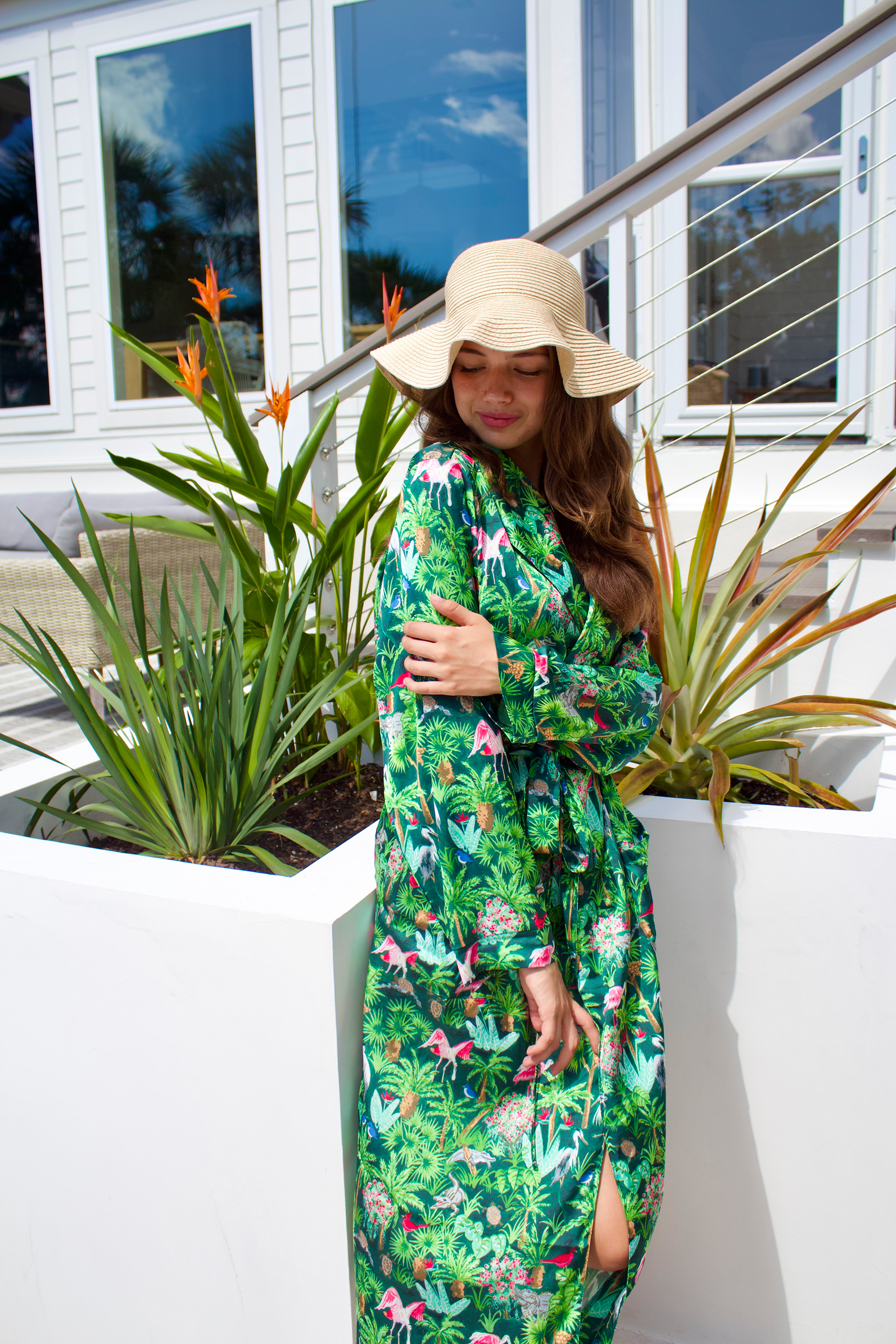 This intense and beautiful print, hand painted for Imbali Charleston, features fauna, flora and animals from the South. The luxury of the satin only adds to the intensity of the design. This design was created by artist, Laurie Hibbert.