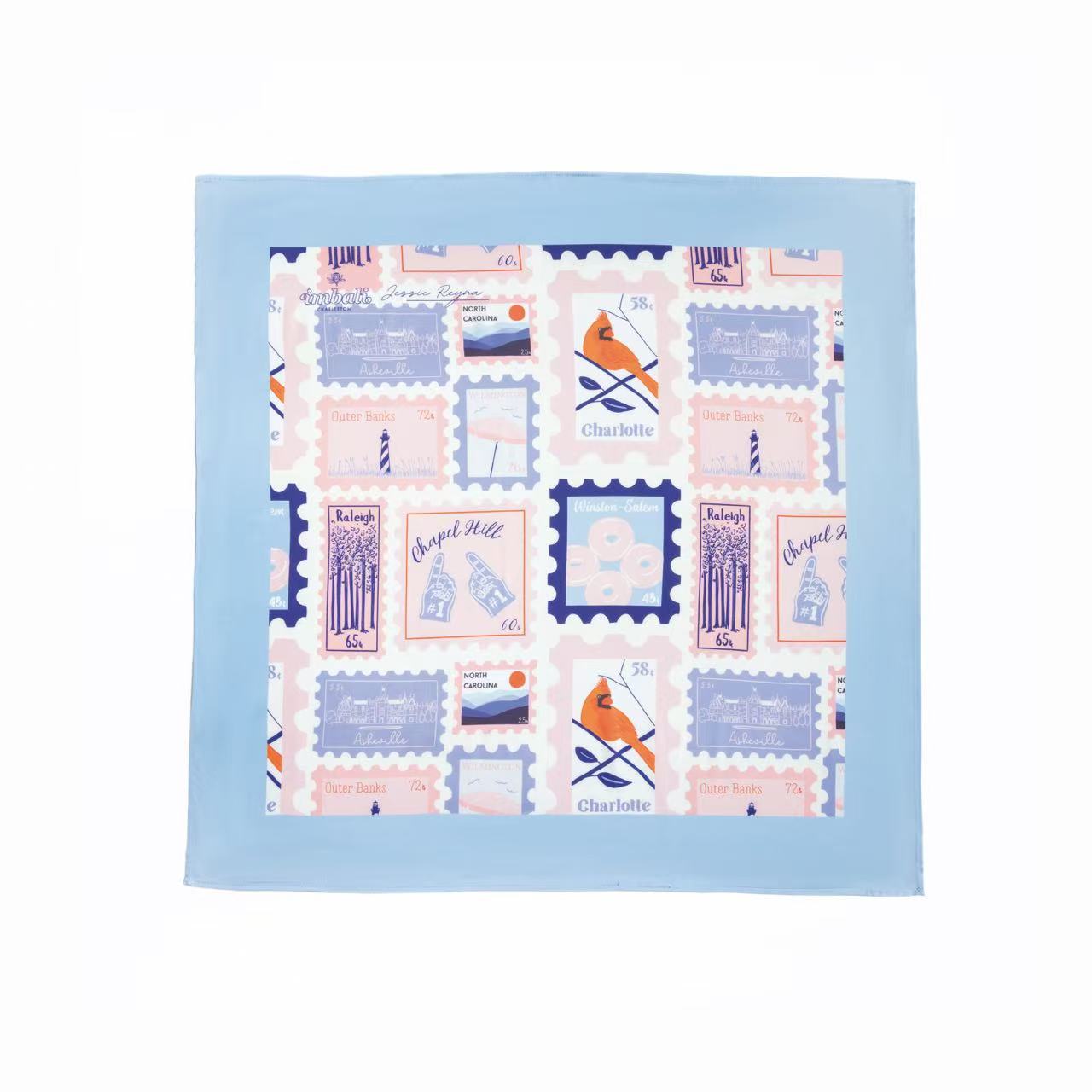 Celebrate the beauty of North Carolina with this exclusive stamp print scarf designed by Charleston-based artist Jessie Reyna. This luxurious accessory features an artful interpretation of North Carolina's iconic landmarks and natural beauty, rendered in a sophisticated stamp-inspired design.
